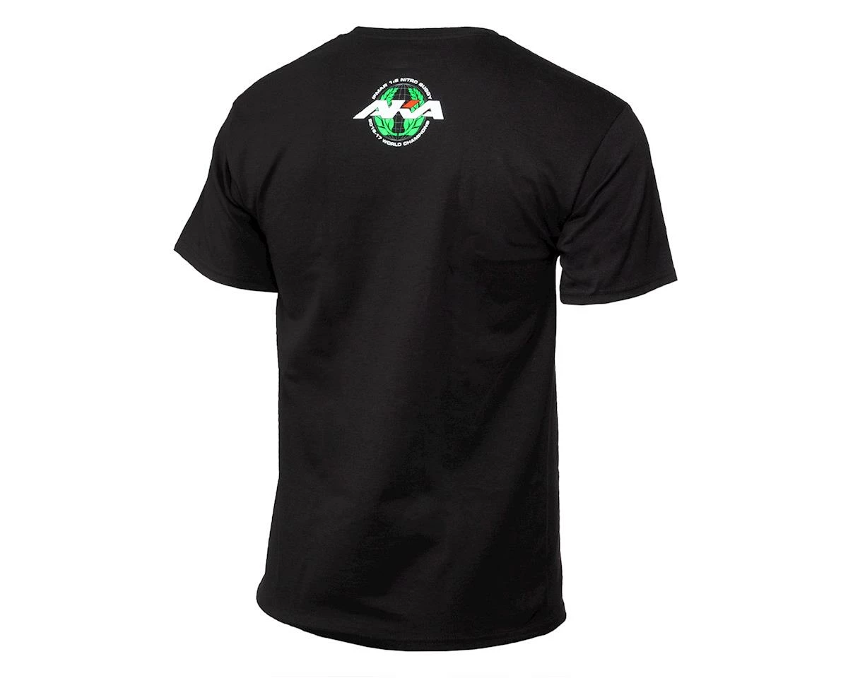 The AKA short sleeve IFMAR World Champions shirt features two-side printing with a large “AKA 1/8 Nitro Buggy 16-17 World Champions” logo on the front and a smaller print of the same logo centered on the back, just below the neck. Printed in the USA on a black Hanes 100% pre-shrunk cotton Tagless black t-shirt.