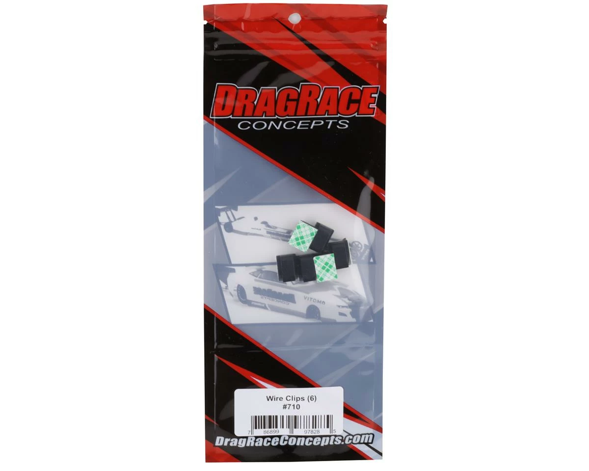 DragRace Concepts Self Adhesive Wire Clips are a great option to clean up servo and various receiver wire routing, and keep the wires tucked away safe and tidy. These black plastic wire clips have an adhesive backer that allows them to stick wherever you need them. Package includes six wire clips.Â