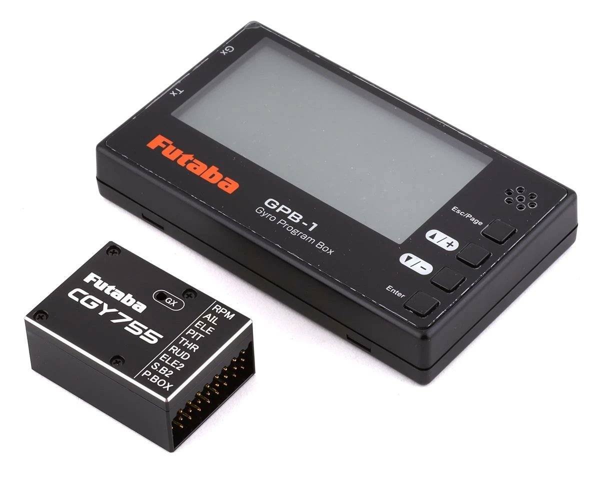 Futaba CGY755 Helicopter Flybarless Gyro System with GPB-1 Programming Box. This Futaba gyro is a great option for those seeking a gyro for their current or next heli build. With 3-axis stabilization, head speed governing and a small footprint this is sure to be a great option for your current or future build. This combo includes the GPB-1 programming box for easy setup.