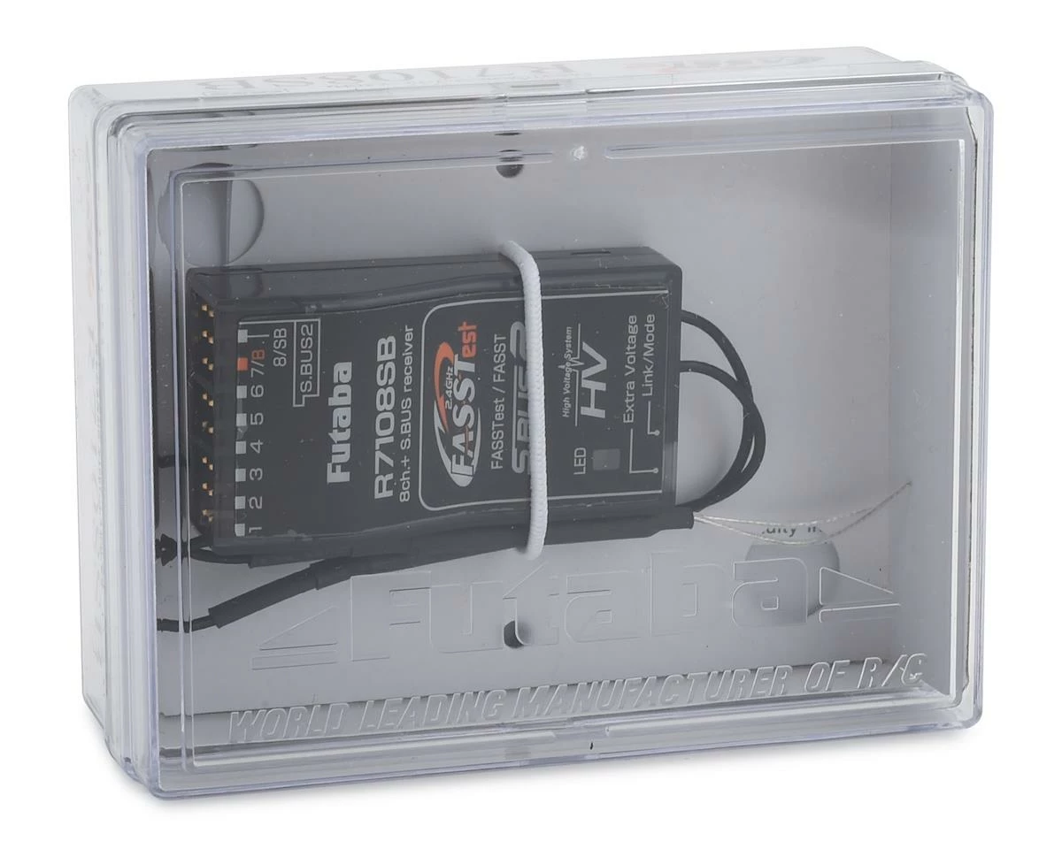 This is the Futaba R7108SB 2.4GHz FASSTest 8+ Channel High-Voltage Receiver for the 32MZ, 18MZ, 18SZ, 16SZ and 14SGRadio System. The 7108 receiver features SBUS and SBUS2 and when used with the Smart Bus SRS system will provide up to 18 input channels with full SBU2 telemetry support for battery monitoring of voltage, current and mAH.