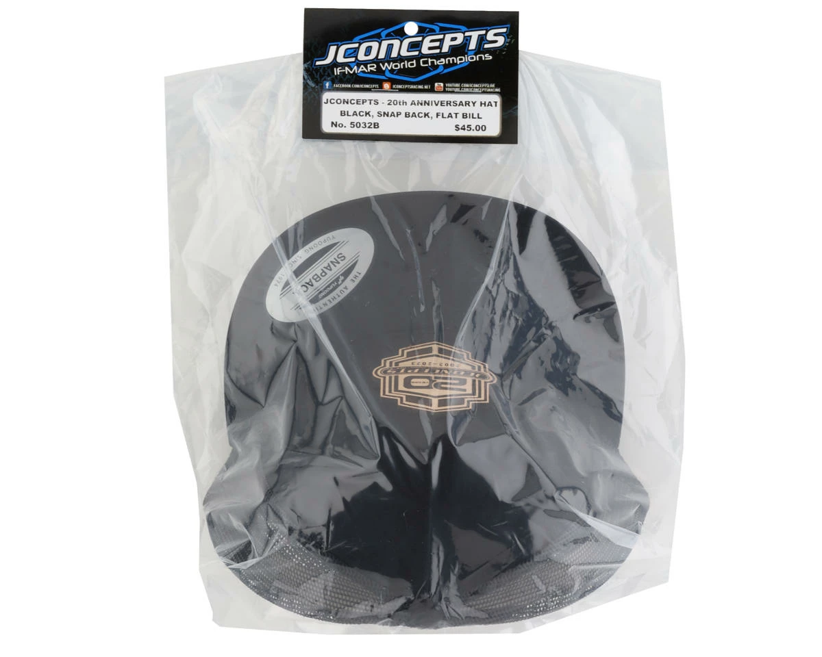 JConcepts “20th Anniversary” 2023 Snapback Flatbill Hat. Celebrating the JConcepts’ 20th anniversary this hat features an “arrow up” holding shape of the new logo design points in both directions while centering off on the 20th lettering and JConcepts logo. The flat bill style hats include leather patchwork with logo and the entire branding sewn to the high-quality hat available in multiple colors. Package includes one hat.