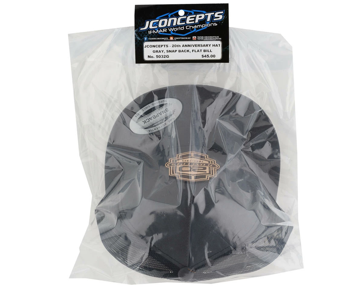 JConcepts “20th Anniversary” 2023 Snapback Flatbill Hat. Celebrating the JConcepts’ 20th anniversary this hat features an “arrow up” holding shape of the new logo design points in both directions while centering off on the 20th lettering and JConcepts logo. The flat bill style hats include leather patchwork with logo and the entire branding sewn to the high-quality hat available in multiple colors. Package includes one hat.