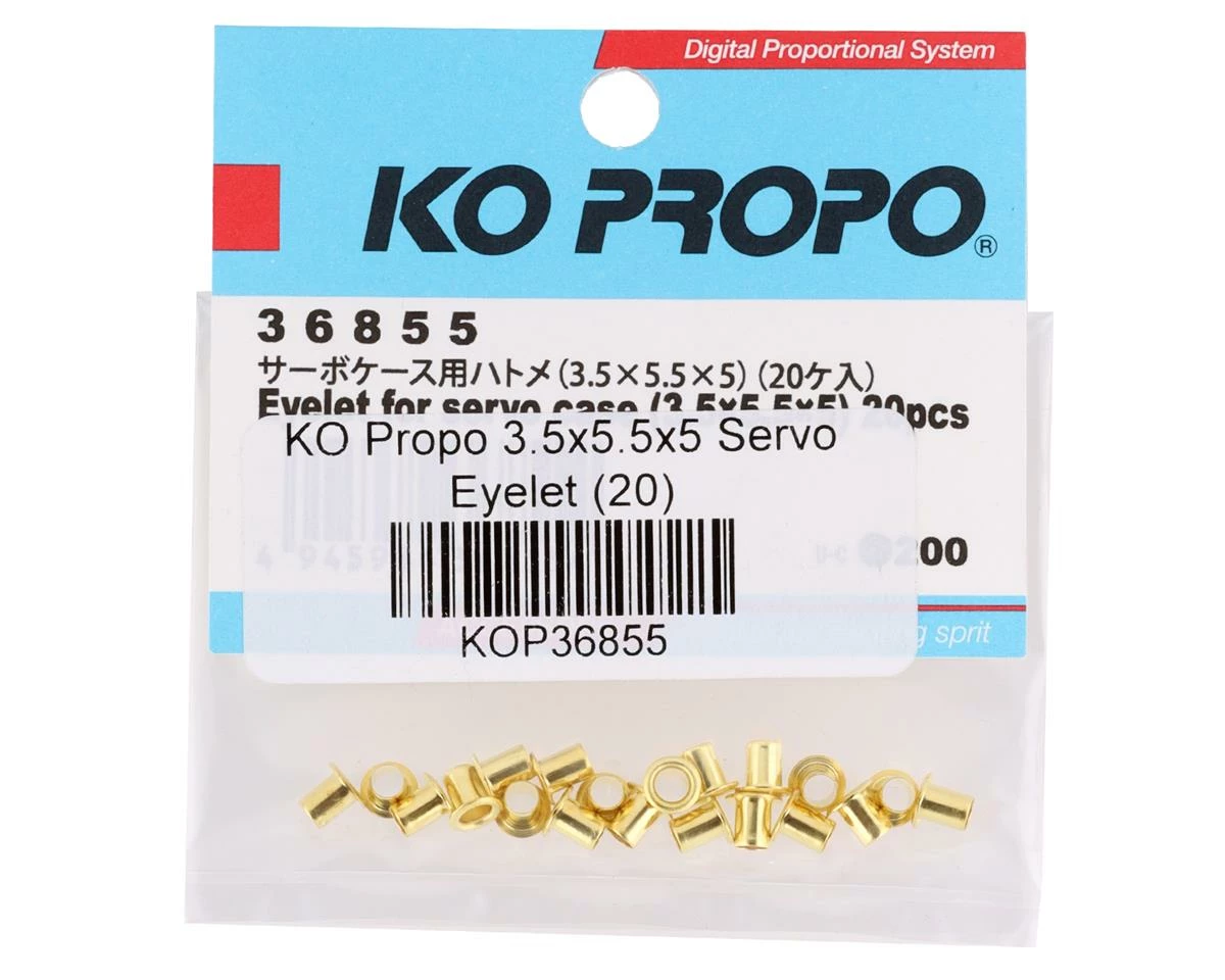 KO Propo 3.5×5.5×5 Servo Eyelets. These servo eyelets are designed to center and add strength when mounting a servo to a chassis. When combined with the rubber grommets (KOP36851 – sold separately) it will allow for a vibration resistant mount. Package includes 20 servo eyelets.