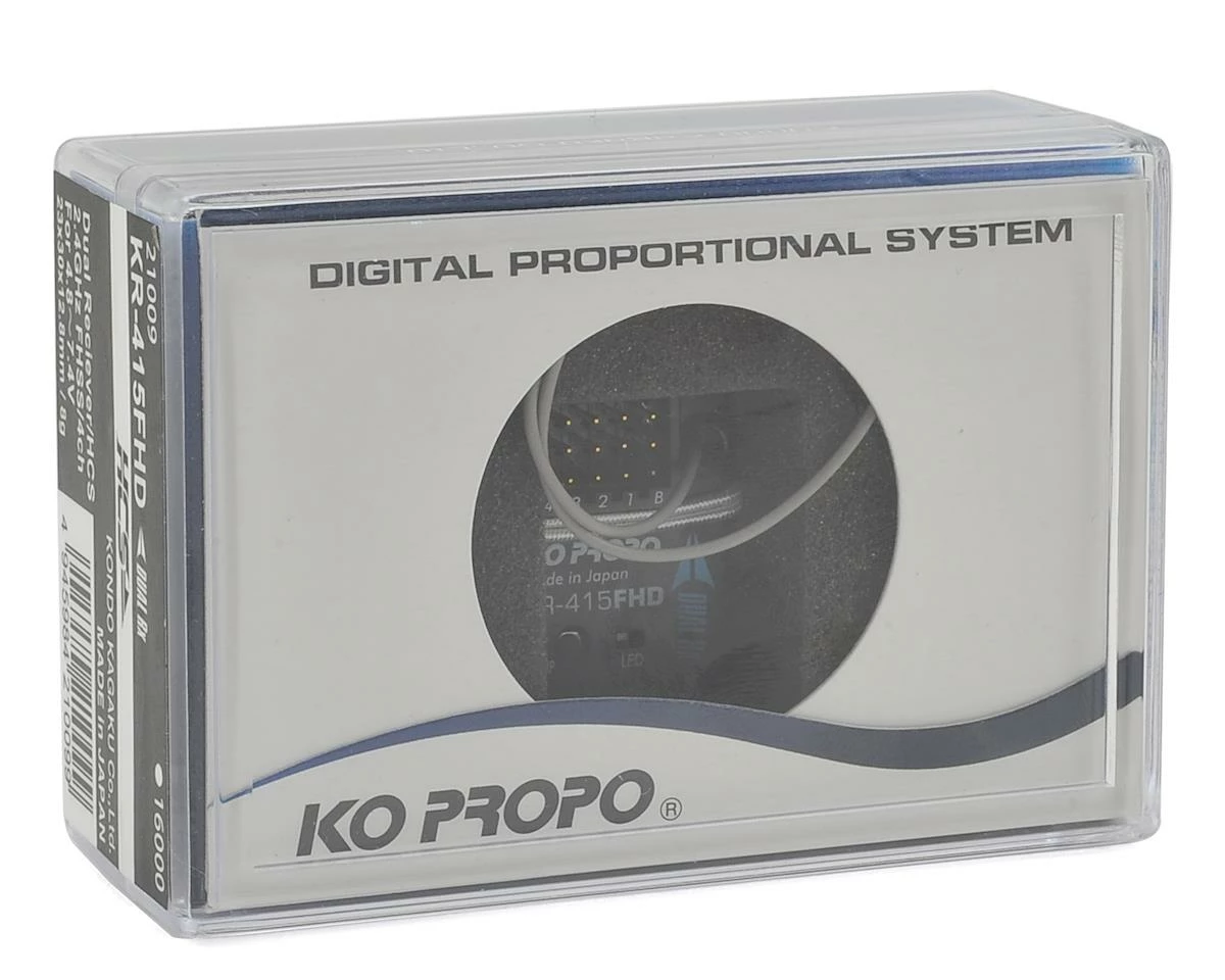 This is the KO Propo KR-415FHD 2.4GHz FHSS Micro Receiver. The KR-415FHD achieves a highly precise receiving performance with the use of a dual circuit and an external and internal antennas. With less of chance of missing a packet of info from the transmitter the result is a very smooth and linear feel.
