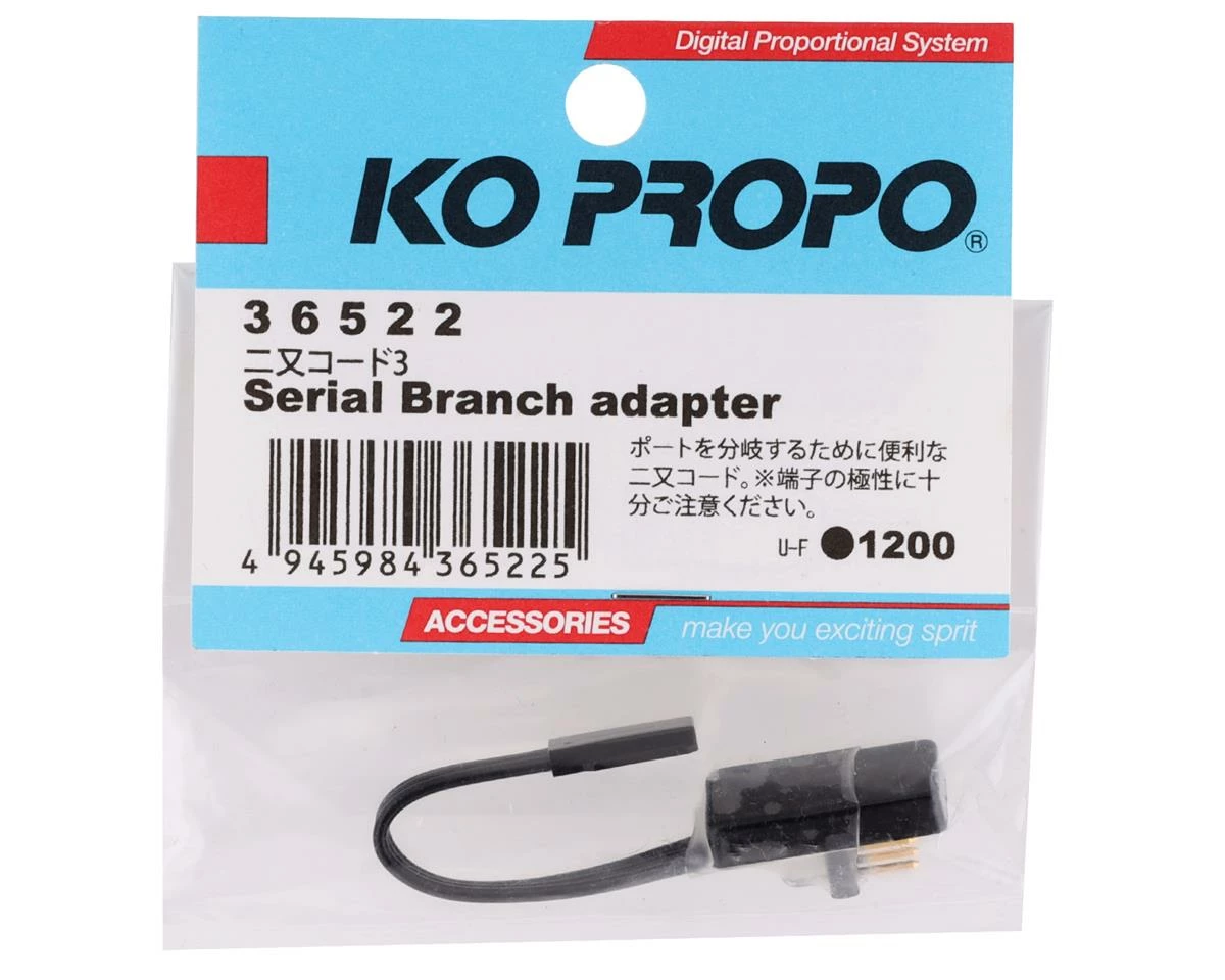KO Propo Serial Branch Adapter. This serial adapter is recommended when connecting two serial servos to the “B/S Serial Port” of your KO Propo Servo. The serial adapter can also be used as a “Y” connector to supply receiver voltage to other components. Package includes one serial branch adapter.