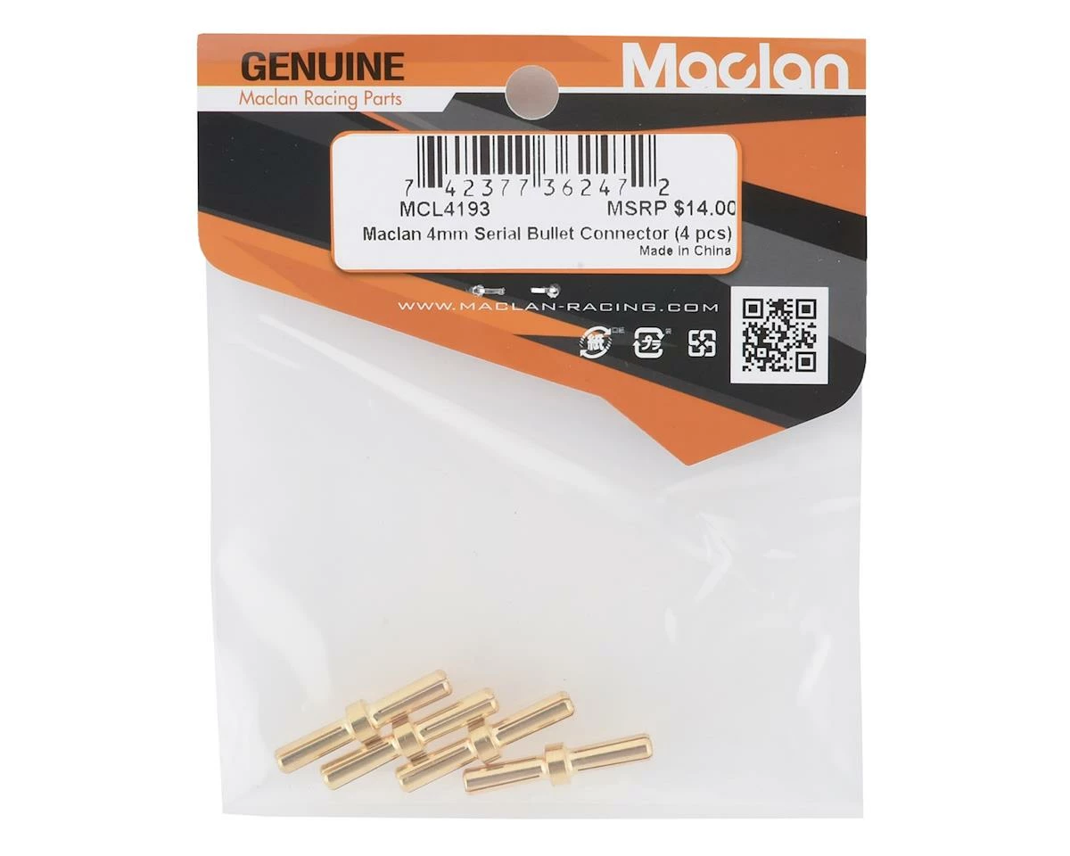 This is a pack of four Maclan 4mm Gold Serial Bullet Connectors. These are gold plated and best for connecting two 2S Li-Po with 4mm bullet connectors into a 4S application.