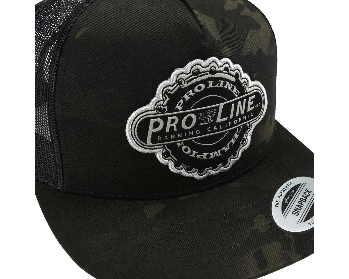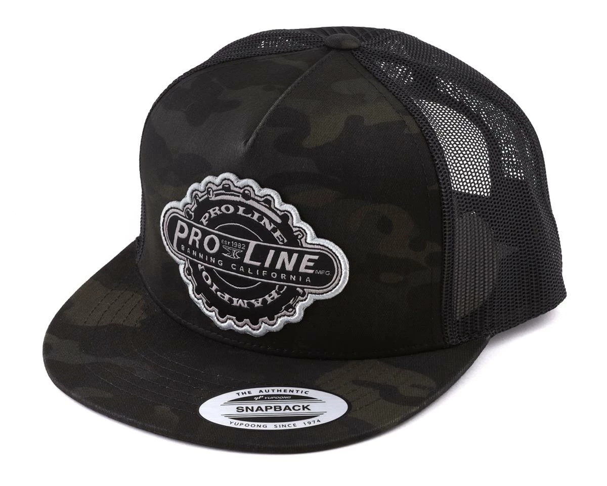 The Proline Manufactured Snapback Hat is a tribute to Pro-Lines manufacturing heritage. Featuring a silhouette of the Champion tire that lead the racing scene in the 80’s and the original anvil logo that was found on early Pro-Line header cards. A dark camo print is used on the front of the hat while the back has an open mesh for the trucker styling. This hat looks great and will be perfect for any occasion. Package includes one snapback hat.