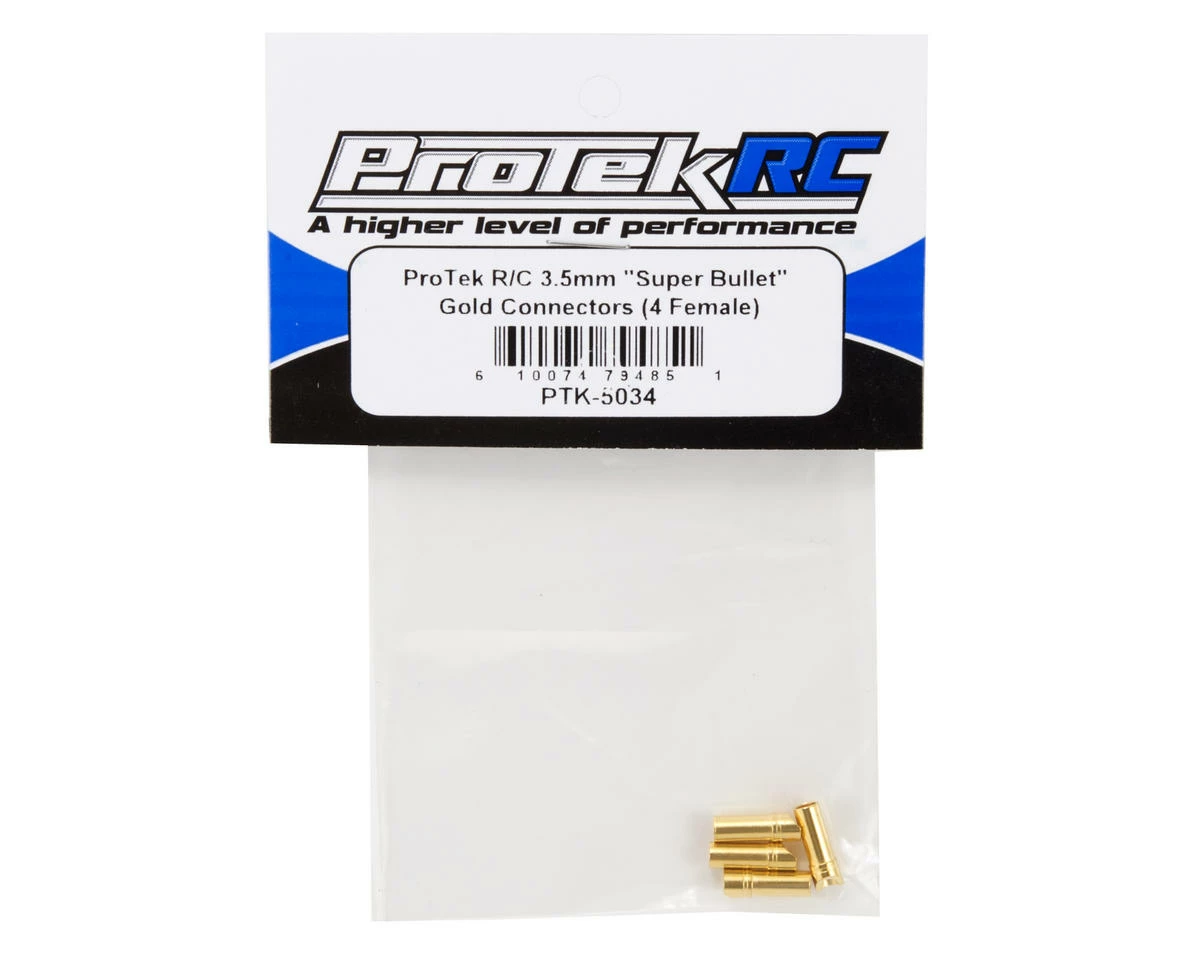 This is a pack of four female 3.5mm diameter gold plated “Super Bullet” high current inline connectors from ProTek R/C. The ProTek R/C “Super Bullet” Solid Gold Connectors are an absolute must for high current / high voltage applications! With lower resistance than a typical Dean’s style ultra plug and traditional spring-type bullet connectors, they are the new standard for brushless motor applications. They can be used for battery connectors or motor to speed control connectors. They are the ideal power connector for devices such as speed controls, battery chargers, and power meters.