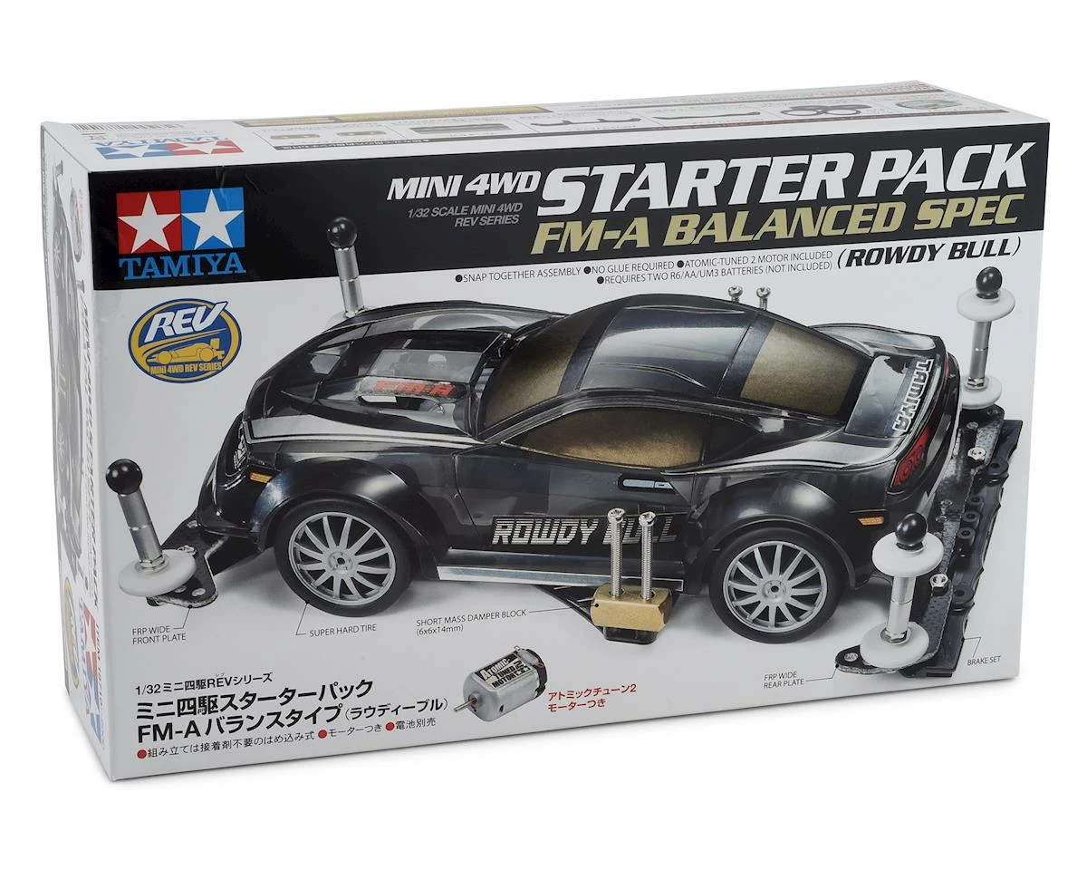 The Tamiya 1/32 JR Balanced Rowdy Bull FM-A Chassis Mini 4WD Starter Pack is a great first purchase for those just getting into Mini 4WD, or for racers who want to experiment with already-tuned machines. The assembly kit of the Rowdy Bull is packaged with parts which give a tuned and balanced setup, suiting it to technical and high-speed circuits, and those in between. Numerous Grade-Up parts are included like super hard tires, short mass damper blocks, brake set parts, stabilizer balls and front/rear wide FRP plates. Hardware for attachment and tools for construction are also included!Â