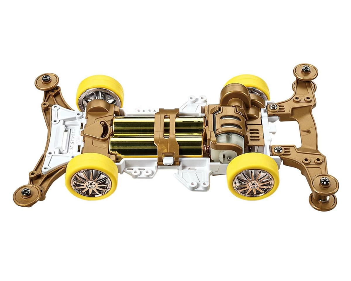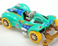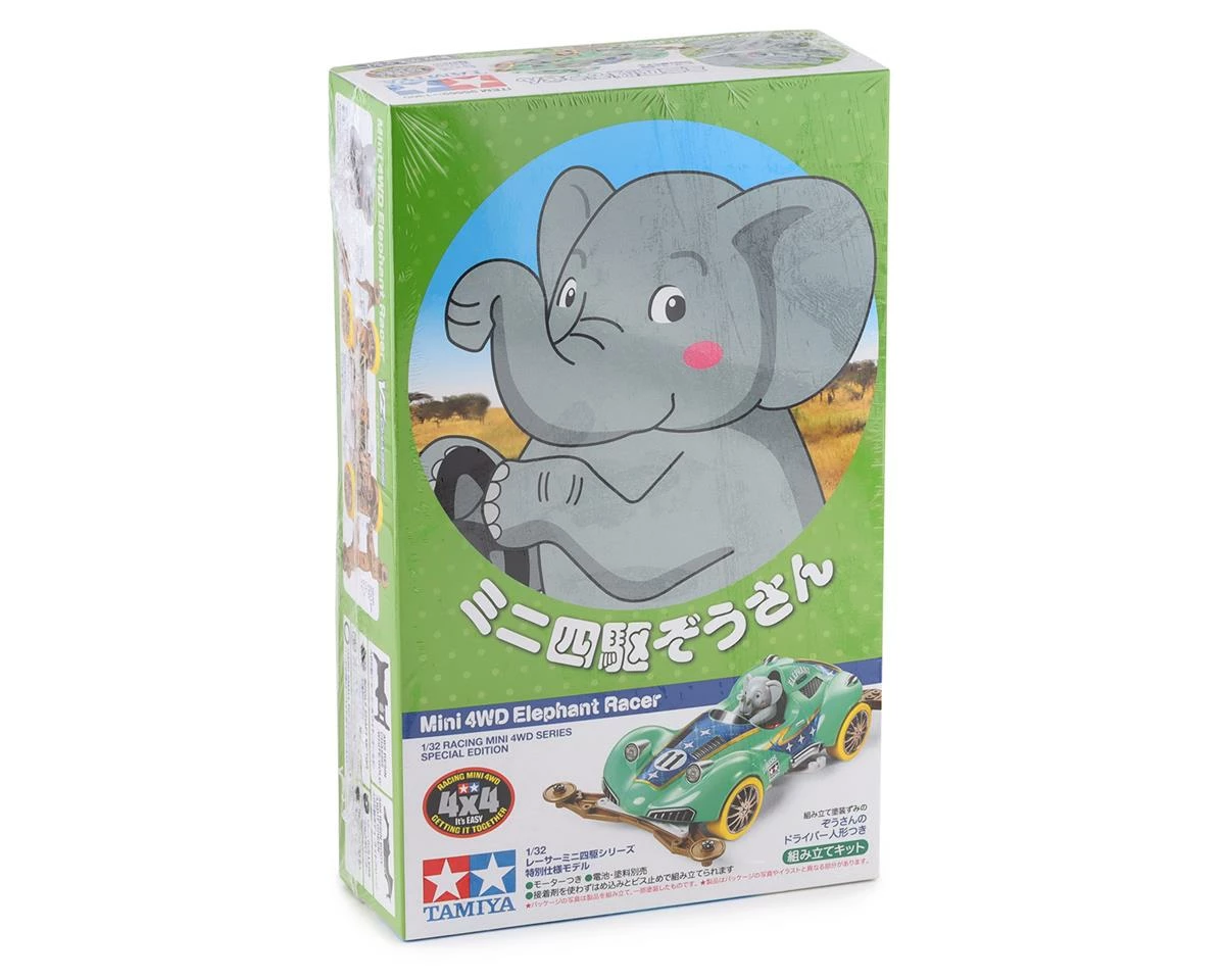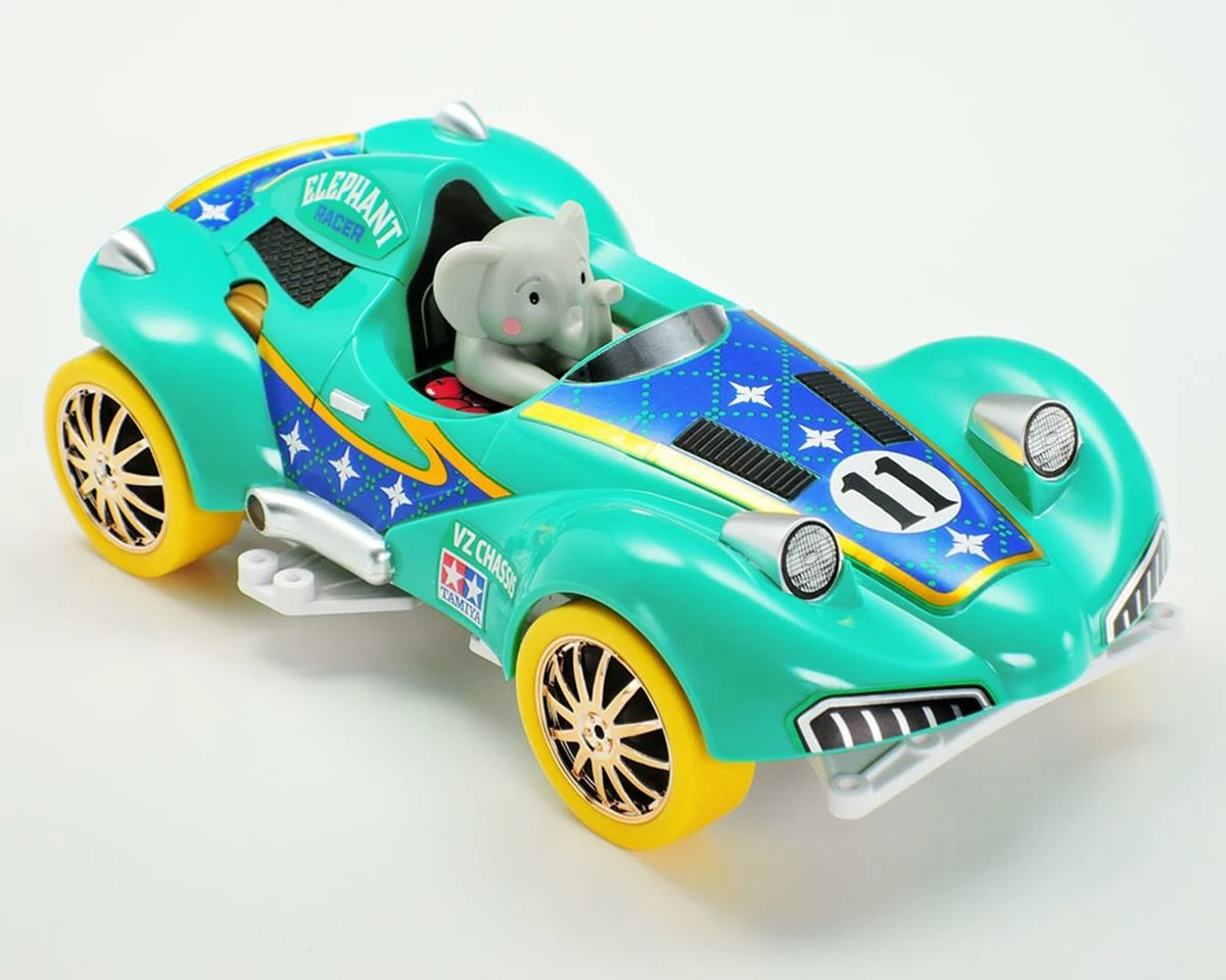 The Tamiya 1/32 JR Elephant Racer Mini 4WD Kit combines an adorable driver with the classic car body first used in the Panda Racer 2 model (TAM18092). The body and driver sit on top the cutting edge VZ chassis.