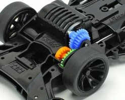 The FM-A chassis is a front motor unit with advanced aerodynamic themes that – thanks to its center of gravity toward the front – is at home on a whole variety of track types including those with frequent elevation changes. It comes equipped with a low-friction front skid bar, while the chassis underside allows easy access to the motor and quick setup changes. Aircraft-inspired aero side stays allow attachment of a range of Grade-Up parts. The chassis is molded in durable ABS, with low friction A parts such as under panel, all in matching black. Smoke color metal-plated A-spoke wheels are combined with low-profile tires, and the model includes 3.5:1 gears.