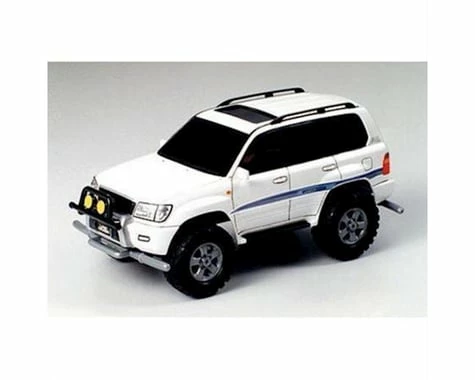 The Tamiya 1/32 Toyota Land Cruiser 100 Wagon Mini 4WD Model Kit, part of the “Mini 4WD” series. This snapfit kit moves requires no glue or paint to complete and moves powerfully forward with the help of two R6/AA/UM3 batteries. Two R6/AA/UM3 batteries are needed to complete. The kit uses a 130 double shaft motor with a standard gear ratio of 3.5:1 and includes silver split spoke wheels and large diameter tires. A decal sheet is included to all realism and style.