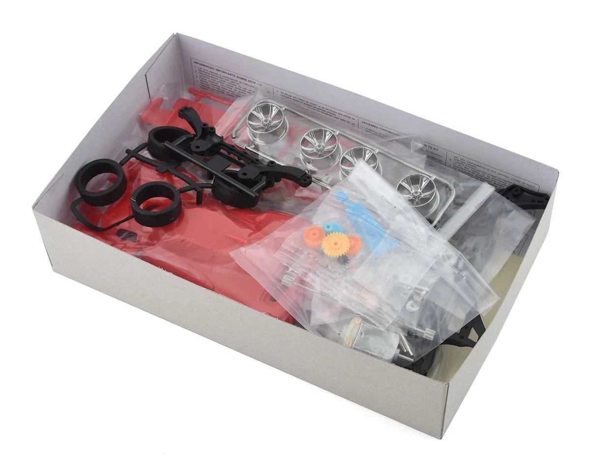 The Tamiya 1/32 JR Trairong Mini 4WD Model Kit celebrates the 25th anniversary of Tamiya’s official importer in Thailand, Siam Tamiya. Its name refers to the Thong Trairong, the name for the Thai tricolor flag which provides inspiration for the model color scheme. It runs on the FM-A chassis, a front motor unit with refined aerodynamics and an easy-access motor position.