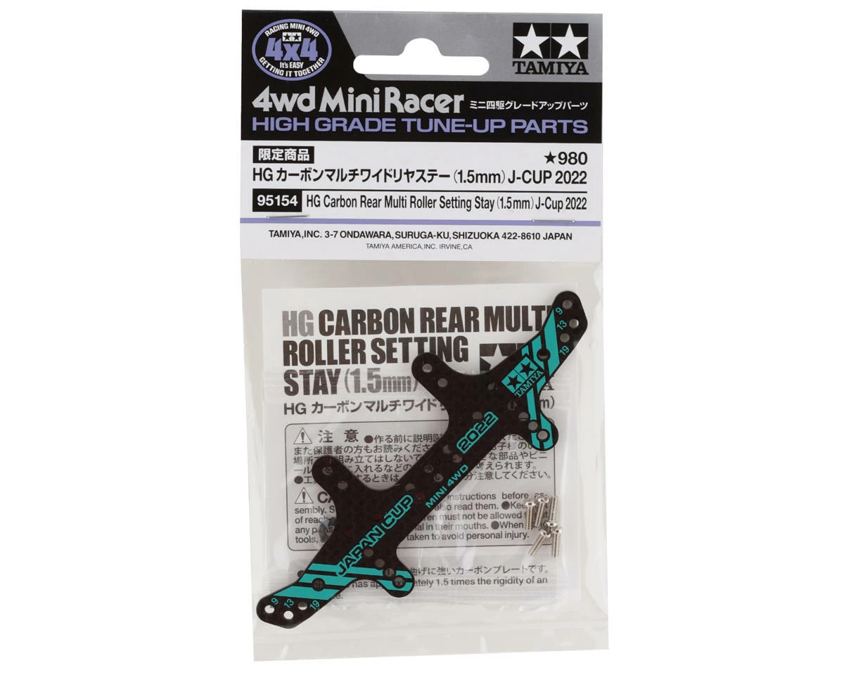 Tamiya JR 1.5mm Carbon Rear Multi Roller Setting Stay. This optional rear multi roller setting stay is an excellent way to add strength, rigidity and style to your Tamiya Mini 4WD vehicle. Designed to replicate the same ones used at the Japan Cup 2022 race this stay comes with limited edition graphics to set your car apart. Â