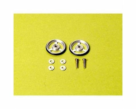 This is a set of Tamiya JR 3-Spoke Ball Race Rollers, Lightweight aluminum roller with three spokes. Rubber rings are included for shock absorption.