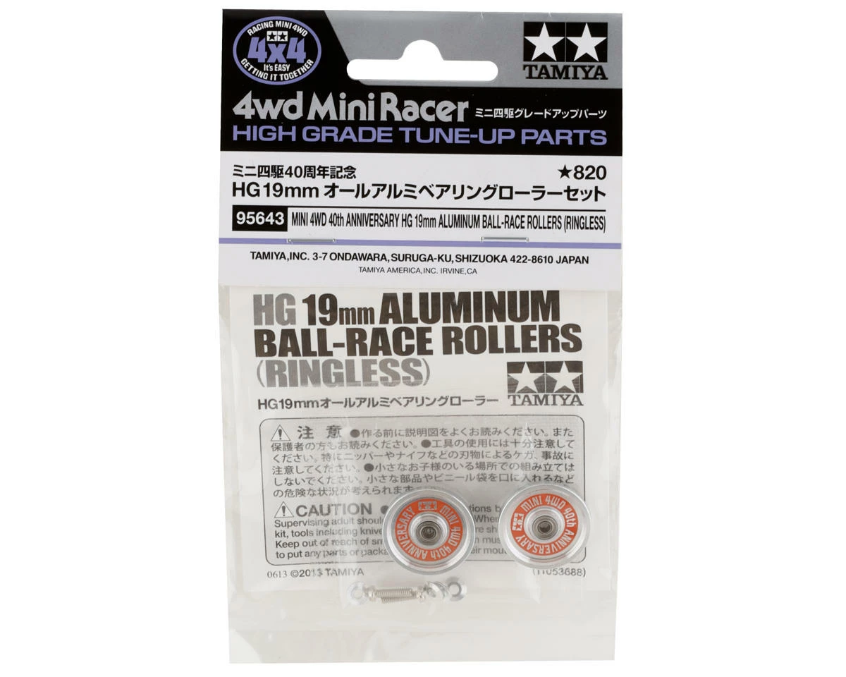 These are the Tamiya JR 40th Anniversary HG 19mm Aluminum Ball-Race Rollers. Designed as an optional accessory for the Tamiya Mini 4WD these 40th anniversary rollers faithfully commemorate this occasion. These lightweight yet tough rollers have built-in 520 ball bearings for smooth performance!