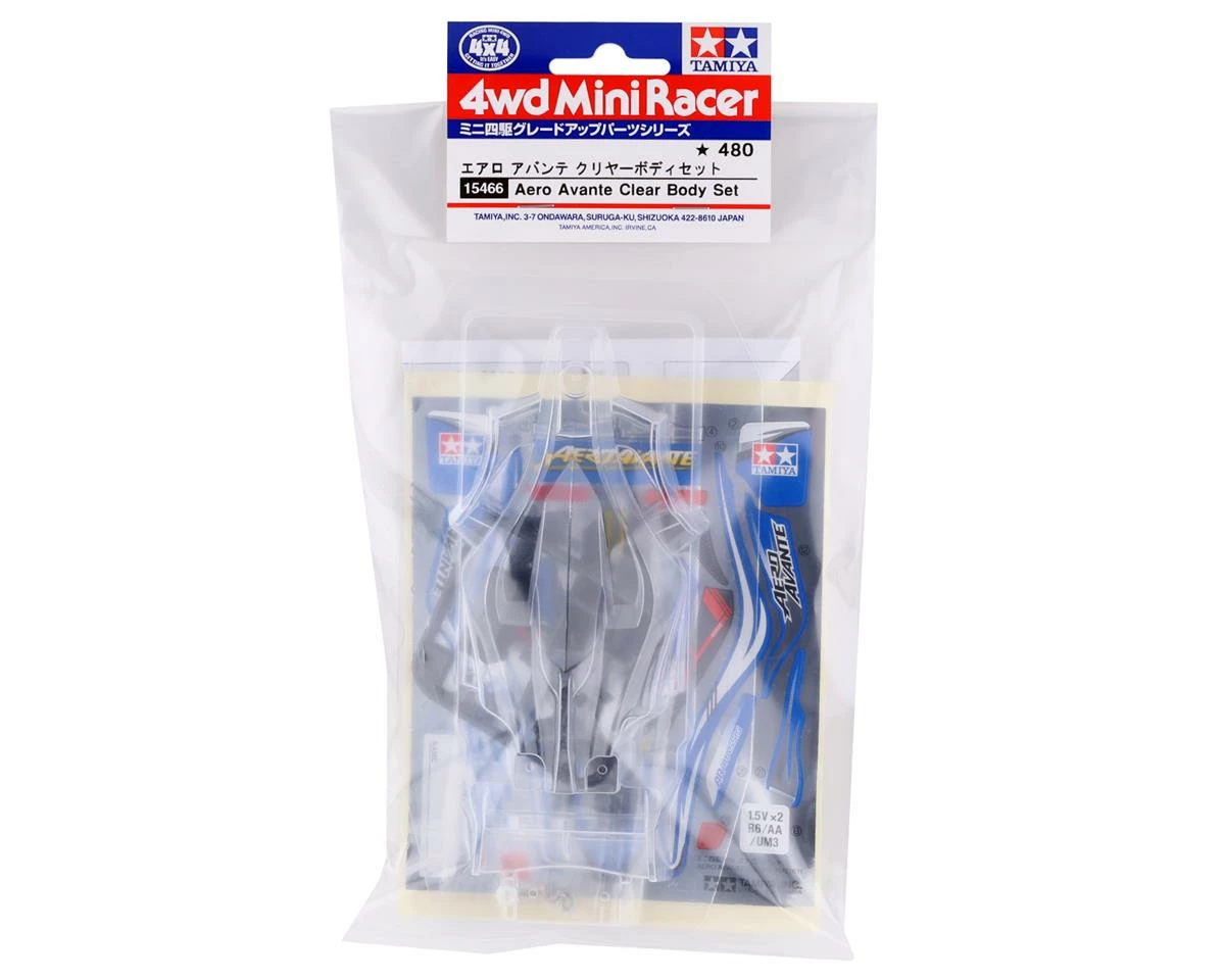 The Tamiya JR Aero Avante Mini 4WD Body Set is a clear body option for the AR chassis. Pick your favorite color of polycarbonate paint and add a custom look to your chassis. The polycarbonate body is lighter-weight and allows better acceleration and higher speeds, in addition to greater stability thanks to its lower center of gravity. Note that by modifying the body, it is also compatible with the VS, Super-II, Super X and Super XX chassis.