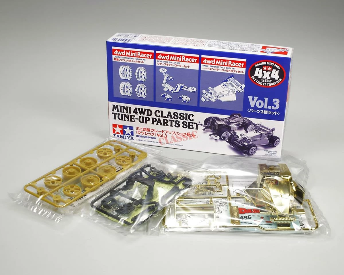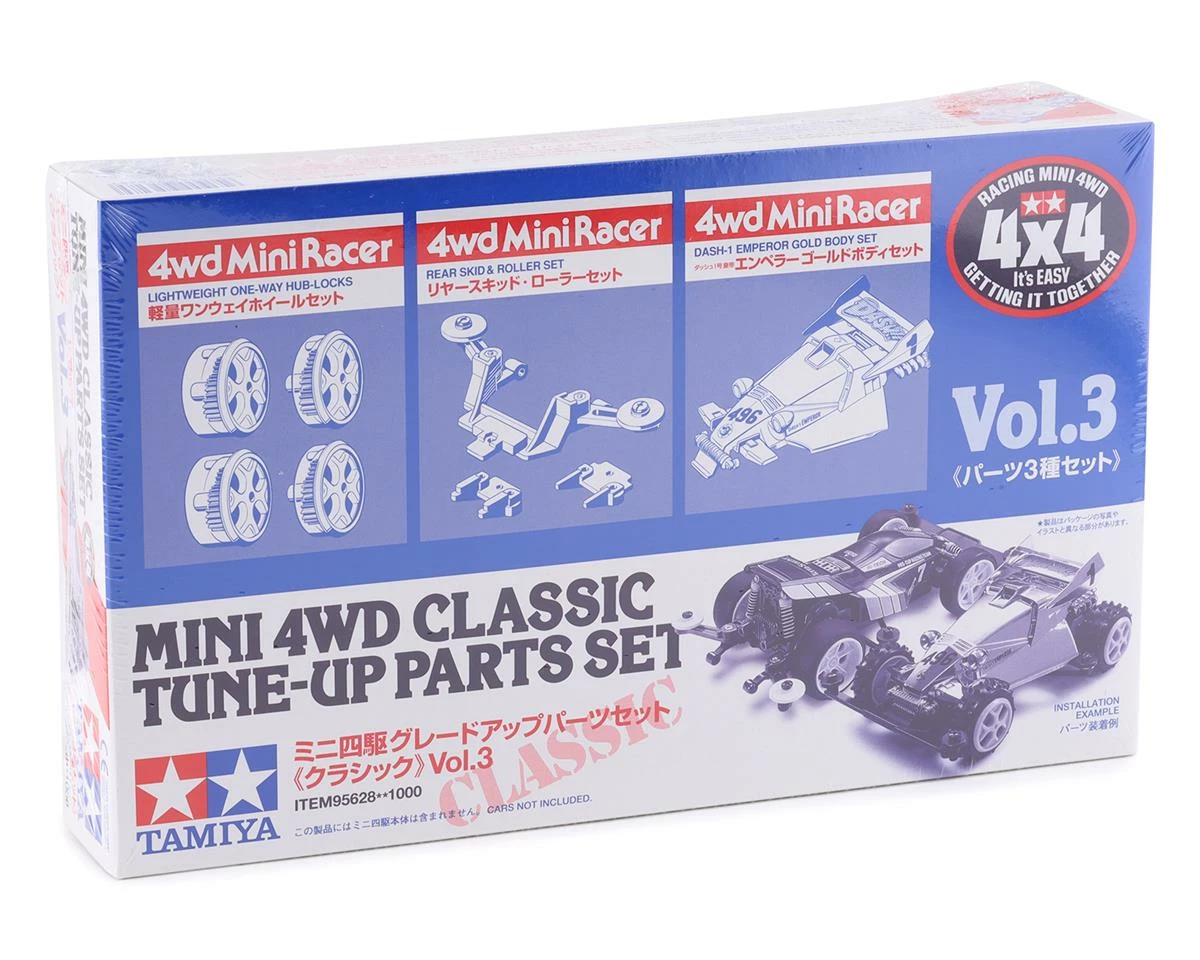 Tamiya JR Classic Tune-Up Parts Set. This special edition of the classic tune-up set is intended for type one and three chassis. Type 2 and 4 chassis can be used when combined with sponge tires (sold separately). Package includes one tune-up set.