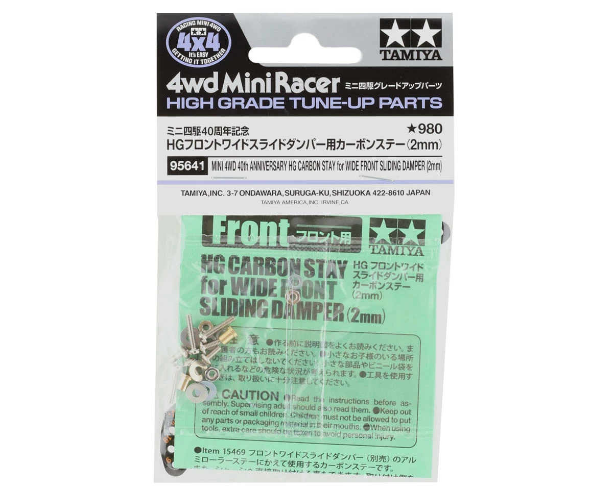 Tamiya JR Mini 4WD 2mm HG Front Wide Carbon Stay. This limited edition stay has been designed to commemorate the 40th Anniversary of the Mini 4WD series. Package includes one wide front damper set.