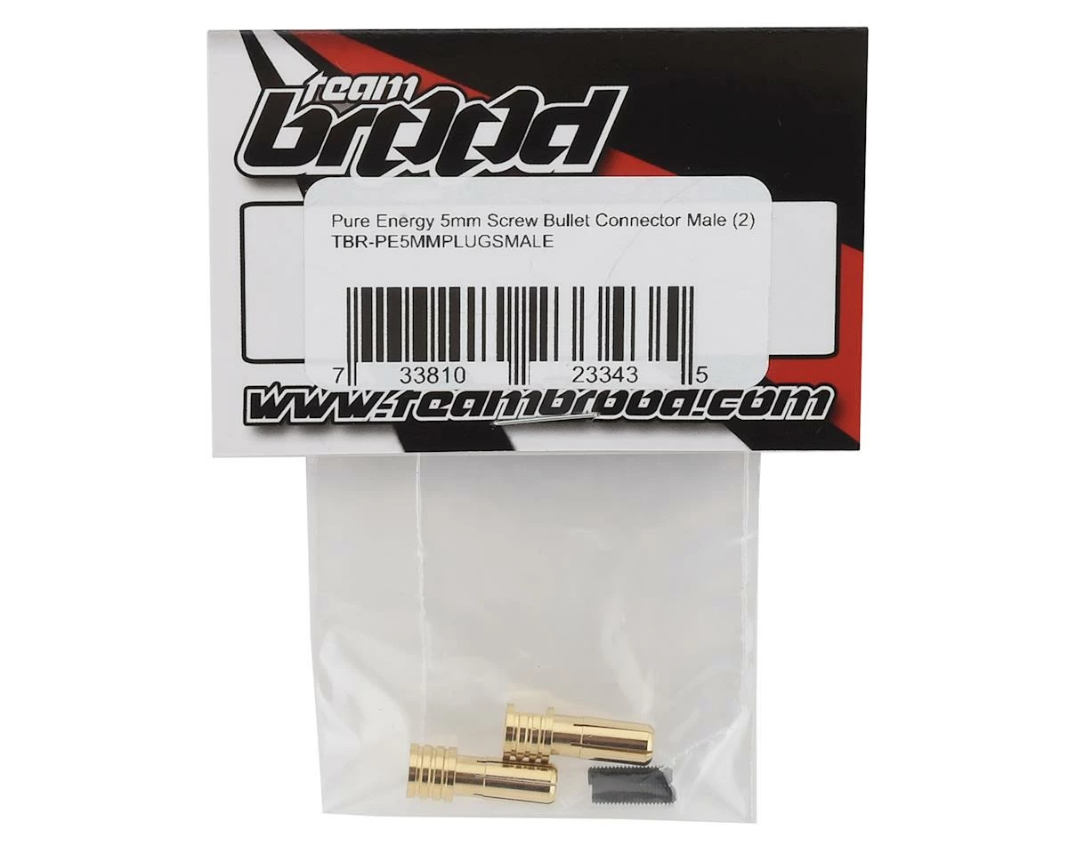 Team Brood Pure Energy 5mm Screw Bullet Connectors provide the ultimate in low resistance connectors, while providing a secure connection for duration of your race. The unique Gold Plated Copper design uses a setscrew to expand the connector for a secure fit against the corresponding connector.