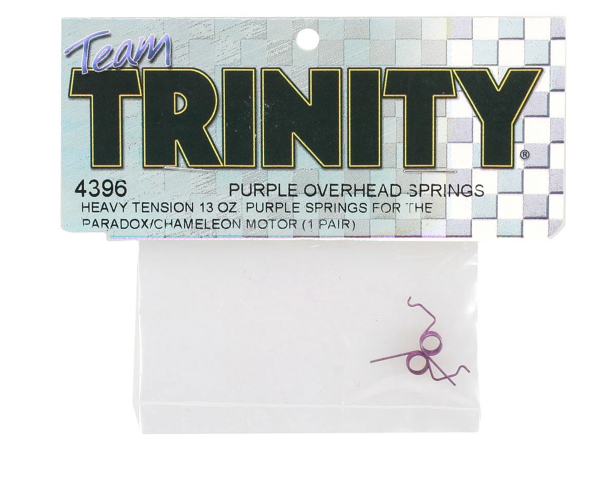 This is a pack of two Trinity Heavy Tension Overhead Brush Springs. These springs are compatible with the Trinity Paradox and Chameleon motors. Package includes two Purple 13oz springs.